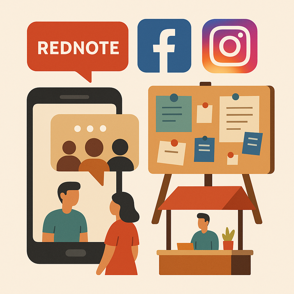 We promote local businesses, nonprofits, and social initiatives through our integrated community network — including Rednote, Facebook, Instagram collaborations, WeChat groups, and community boards at partner restaurants and venues.